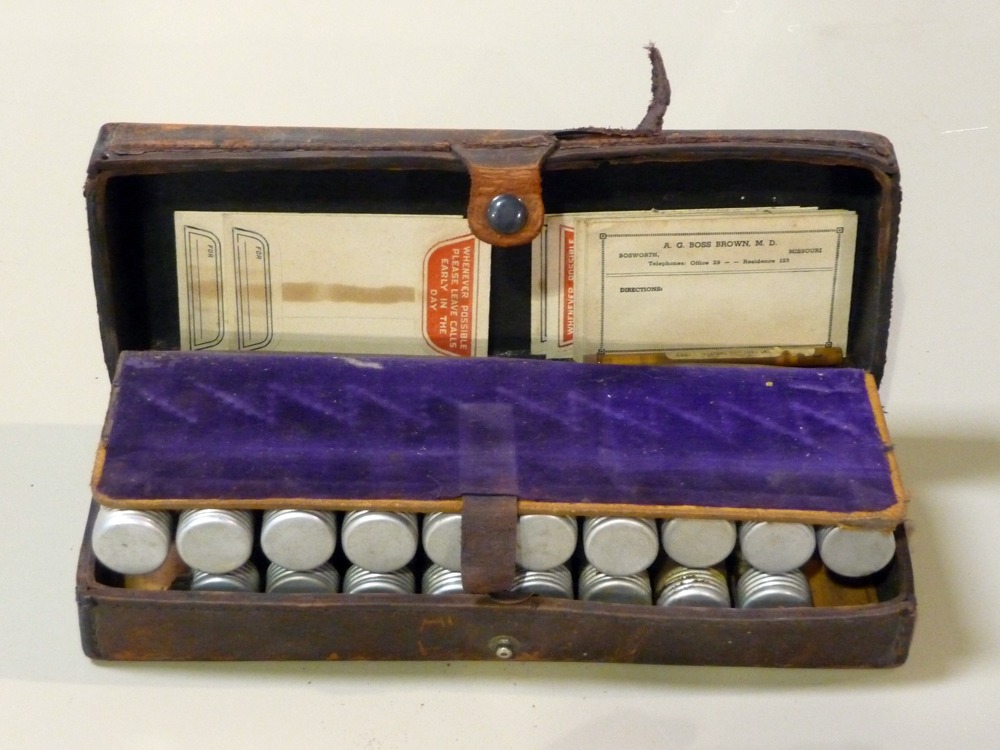 We have several doctors’ bags and lots of vials and bottles of medicine. This is one of the smaller ones, and would probably have been carried in a larger bag. It dates from the turn of the 20th century. The case is about a foot long and covered in leather.
