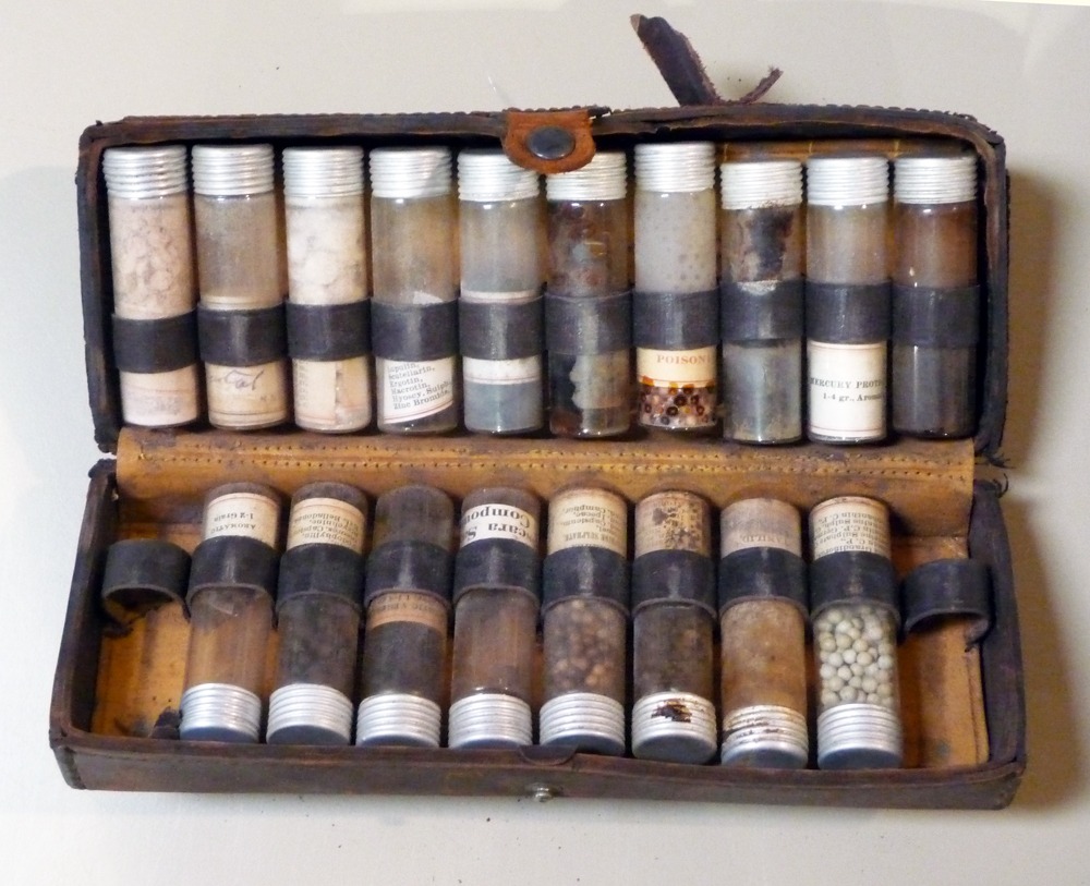 1. Calomel aromatic – Calomel is another name for mercury chloride, used as a diuretic, laxative, and emetic in the days of “heroic medicine“, which, thankfully, are long past. Heroic medicine basically involved using the most aggressive treatments available, and included bleeding (which had fallen out of favor by the time this kit was in use) and strong purgatives (drugs that caused vomiting, diarrhea, or sweating). We know now, of course, that the additional physical stress inflicted on patients who were already ill frequently did more harm than good.
